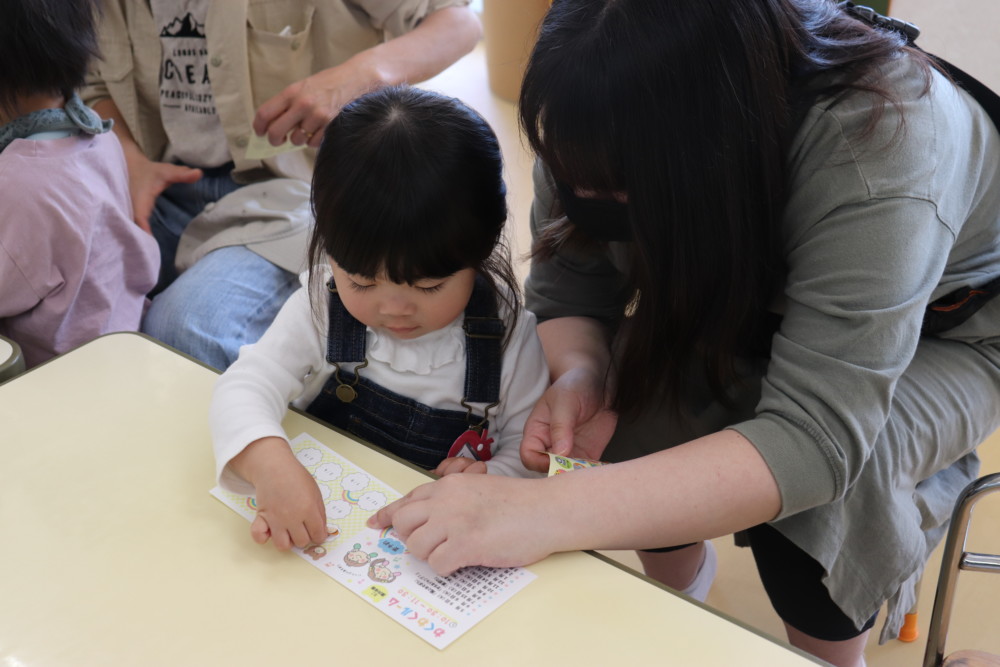 日付を確認した後は、お家の人と一緒に、出席カードにシールを貼ります。