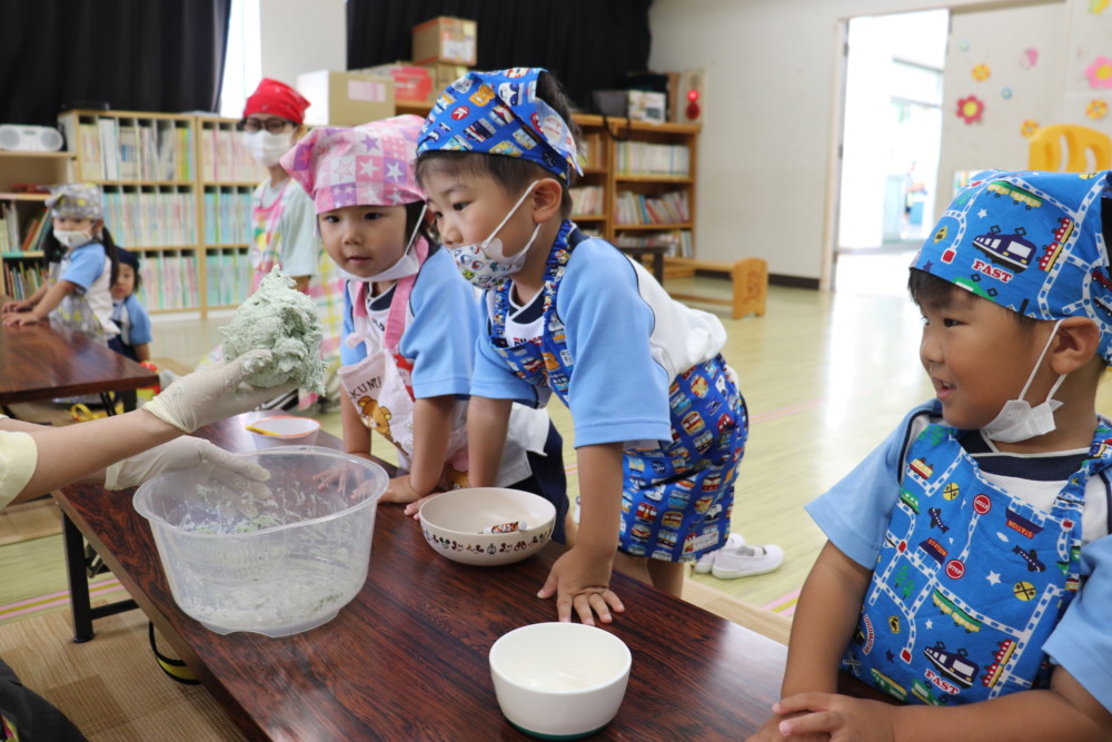 まずは年長さん。保育者がボールに白いだんご粉と色鮮やかなよもぎを入れました。