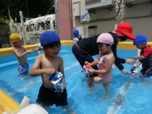 雨が続いてプールに入れない日が続いていましたが、今日久しぶりに晴れて子どもたちもにっこり(*^-^*)