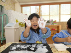 満3歳うさぎ組ではお月見のウサギさんを足型で作りました。
