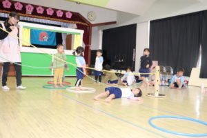 自分で考えながら、いろいろな体の使い方で縄を通り抜けたぱんだ組のお友だち。