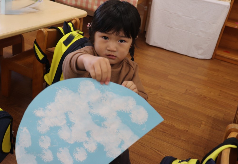そして帽子製作では白い絵の具を使ってポンポンポンと水色の台紙に雪のスタンプしていきました。