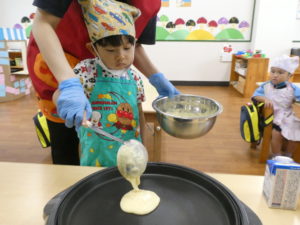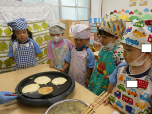 と自分のホットケーキが焼けるのをじーっと見守る子どもたちでした♡
