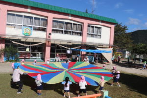 年中ぱんだ組さんは、運動会で年長組のお友だちが取り組んだパラバルーンに挑戦!