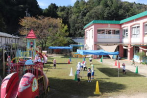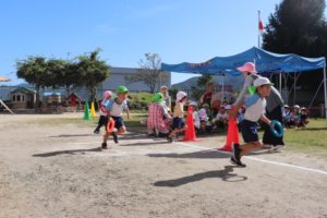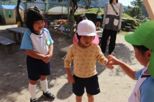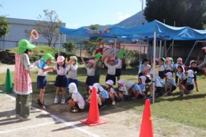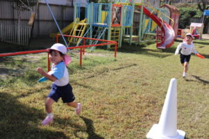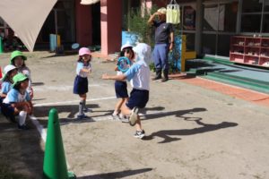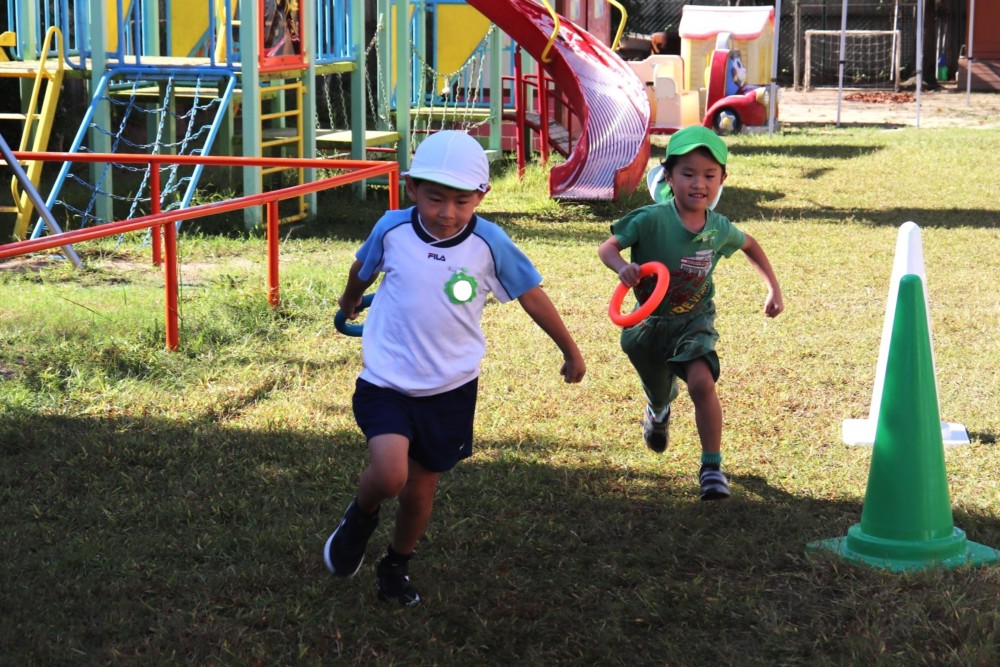 その後は、年長くま組さんと一緒に、リレー遊び!!
