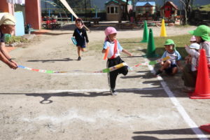 力いっぱい走り、お友だちを応援しながらバトンをつなぎました!