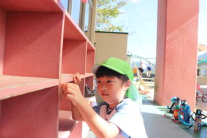 お外遊びの中では、靴箱にいたナナフシを発見!