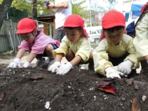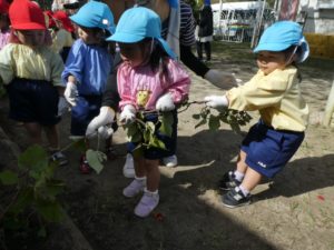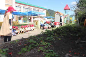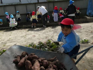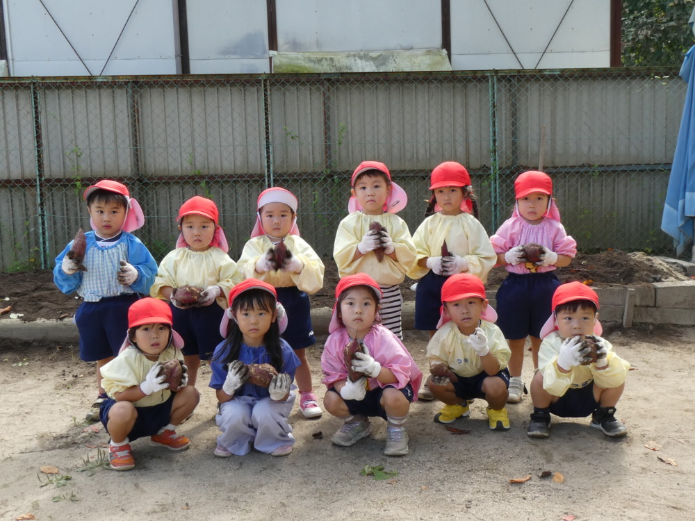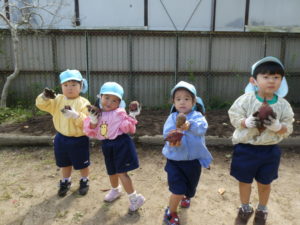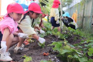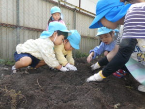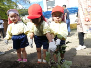 満3歳うさぎ組、年少うさぎ組のお友だちは、幼稚園の畑でさつまいも掘りをしました。