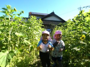 ひまわり畑の迷路になっていてこどもたちは「ぼくはこっち!」
