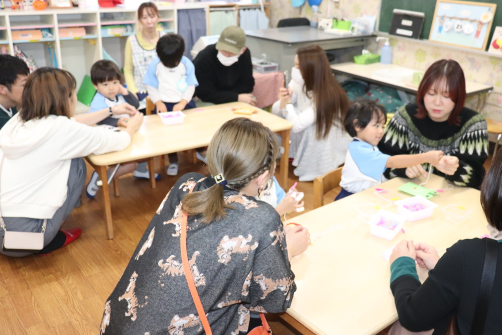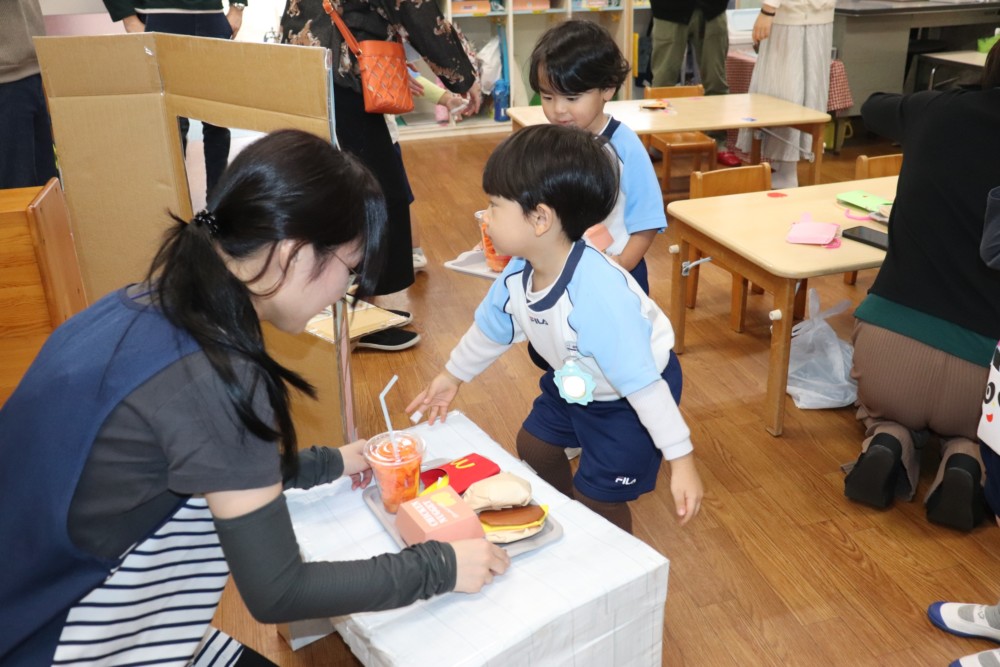 今日は、満3歳うさぎ組さんは、お部屋で遊んでいるハンバーガーごっこをお家の人と一緒に楽しみました。