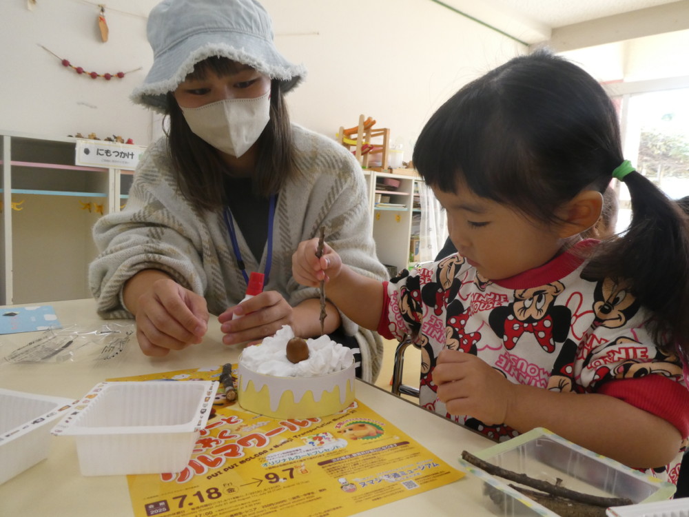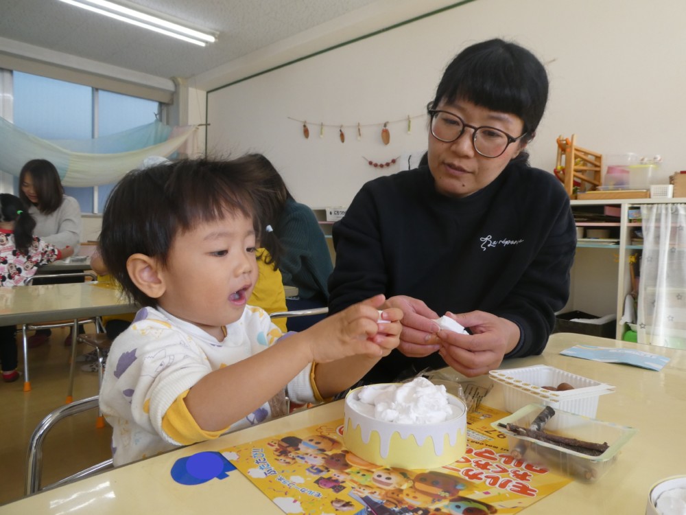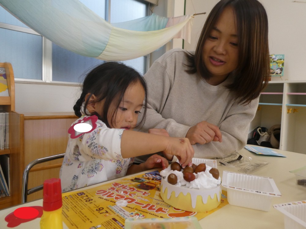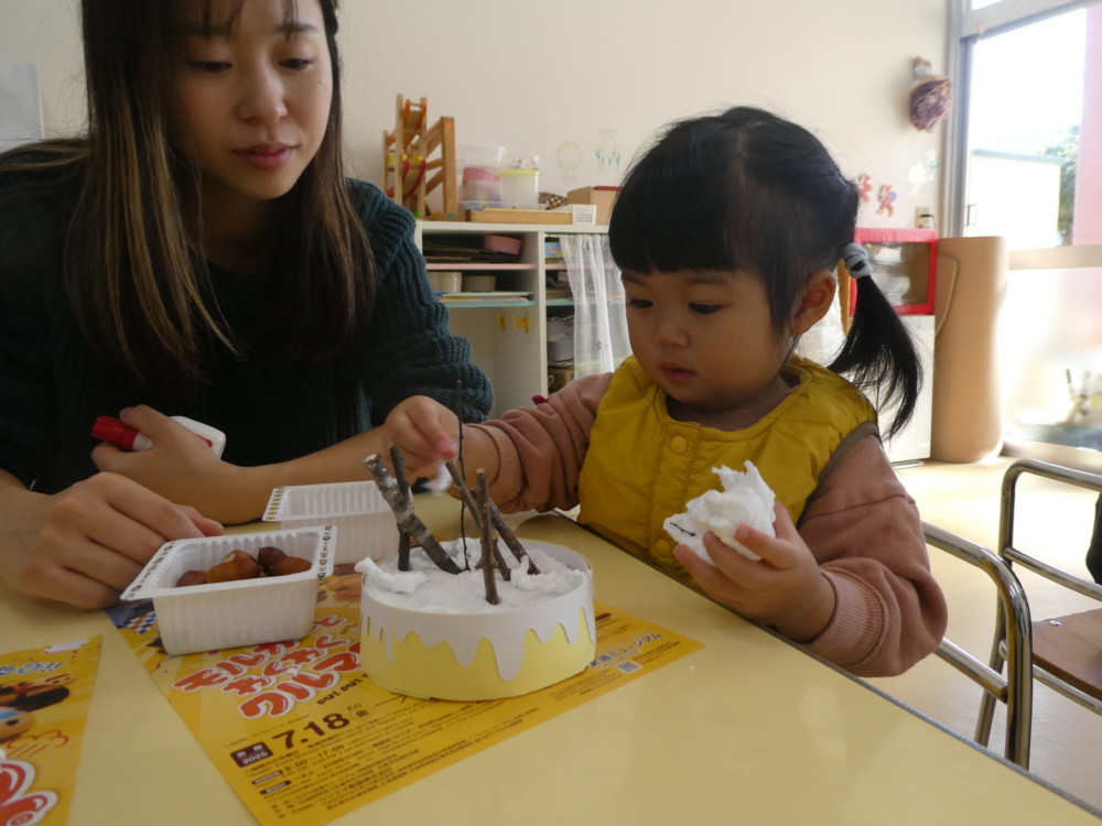 今日のわくわくルームでは朝のお集りの後、どんぐりのケーキを作りました。
