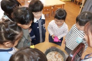 材料を入れると「もうおいしそう!」「いっぱい入ってる!」と食べることを待ちきれない様子でしたよ☺