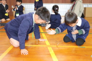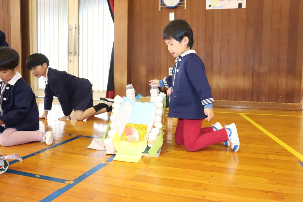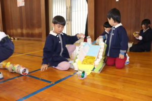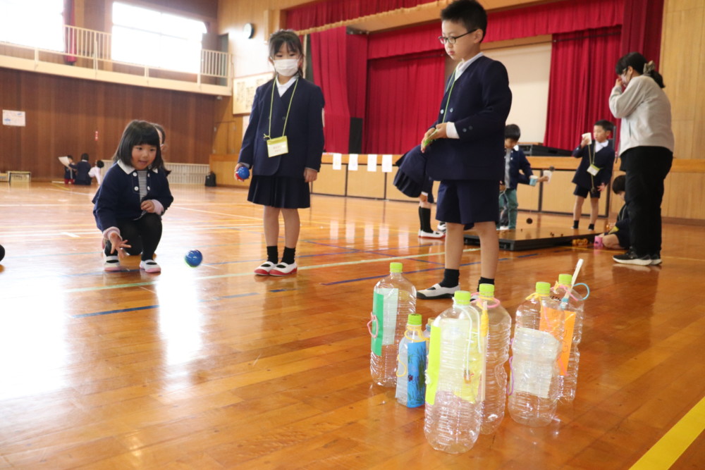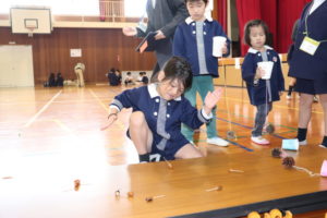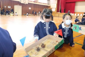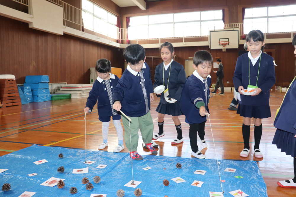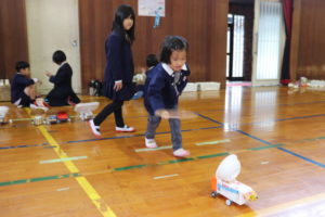 1、2年生のお兄さんお姉さんが準備した手作りおもちゃのコーナーへグループごとに案内され、遊び方の説明をよく聞いて