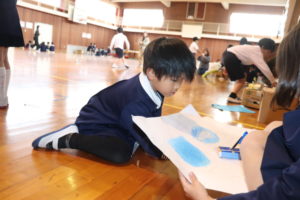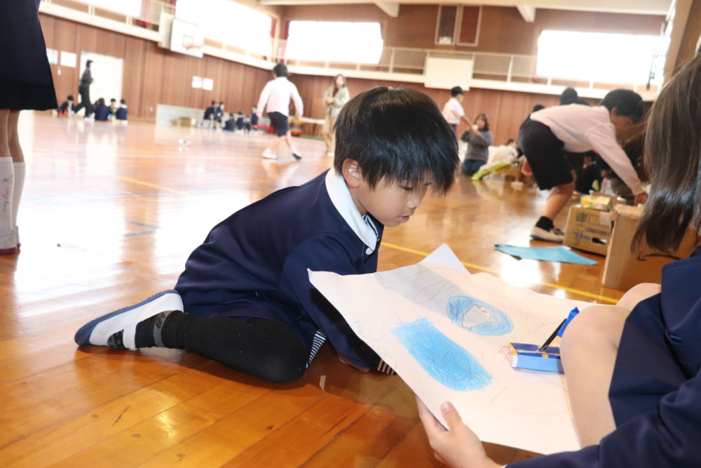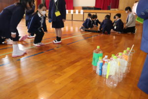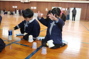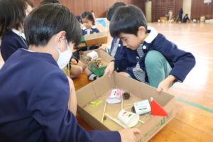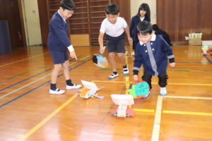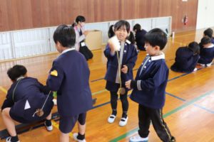 今日は、久地南小学校の1、2年生との交流会で、おもちゃランドに参加しました。