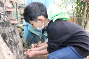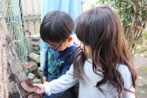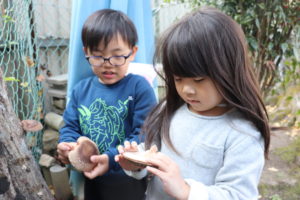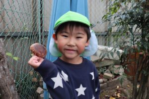 先週、園庭に設置しているシイタケの原木に立派なシイタケが出来ていたので、12月のおむすび当番さんが収穫しました!