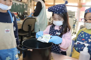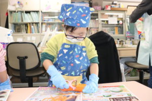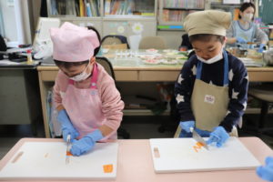 年長さんは人参、玉ねぎ、チンゲン菜、そして先週採ったシイタケを小さく丁寧に切りました。