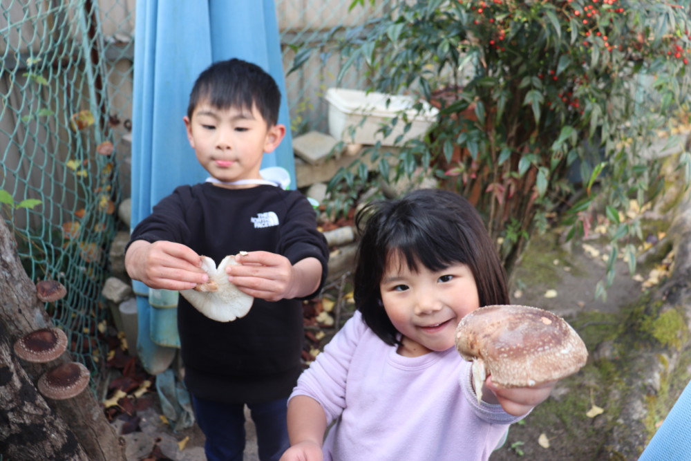 先週、園庭に設置しているシイタケの原木に立派なシイタケが出来ていたので、12月のおむすび当番さんが収穫しました!