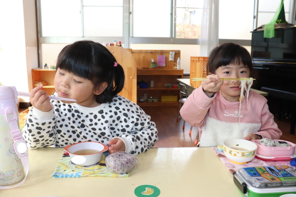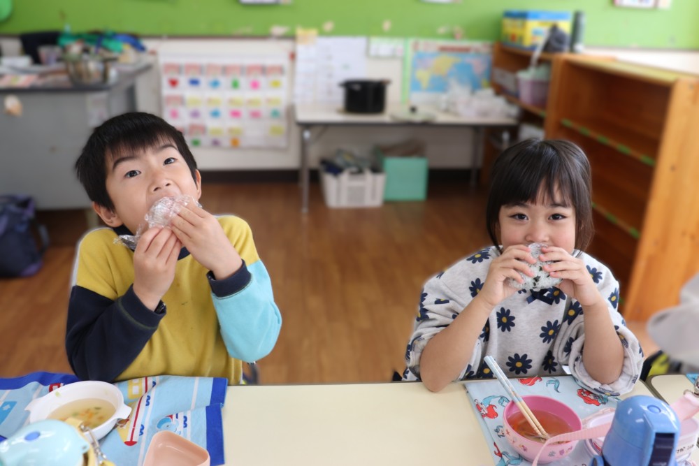 「いただきます!」の挨拶の後、大きなお口でおむすびを食べ、温かい中華スープを一緒にいただきました。