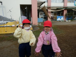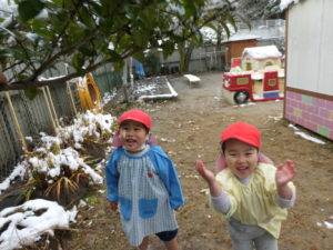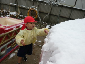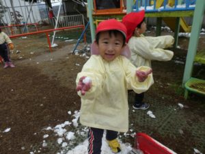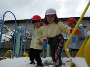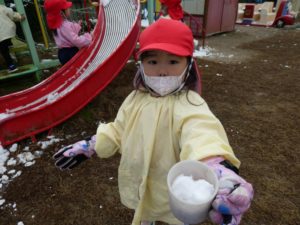 「あ!雪積もってる!」「エルサの世界みたい~!」と園庭に少し積もっている雪にまたまた大喜び!