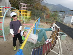 早速遊び始め、補助具を利用し逆上がりをしています。