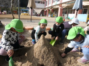 みんなで協力し、声を掛け合いながら大きな山やトンネルを作っています!