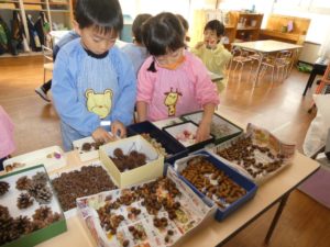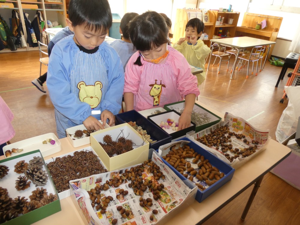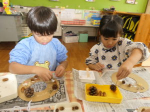 拾ったものやお家から持ってきてくれたどんぐりも使いました。