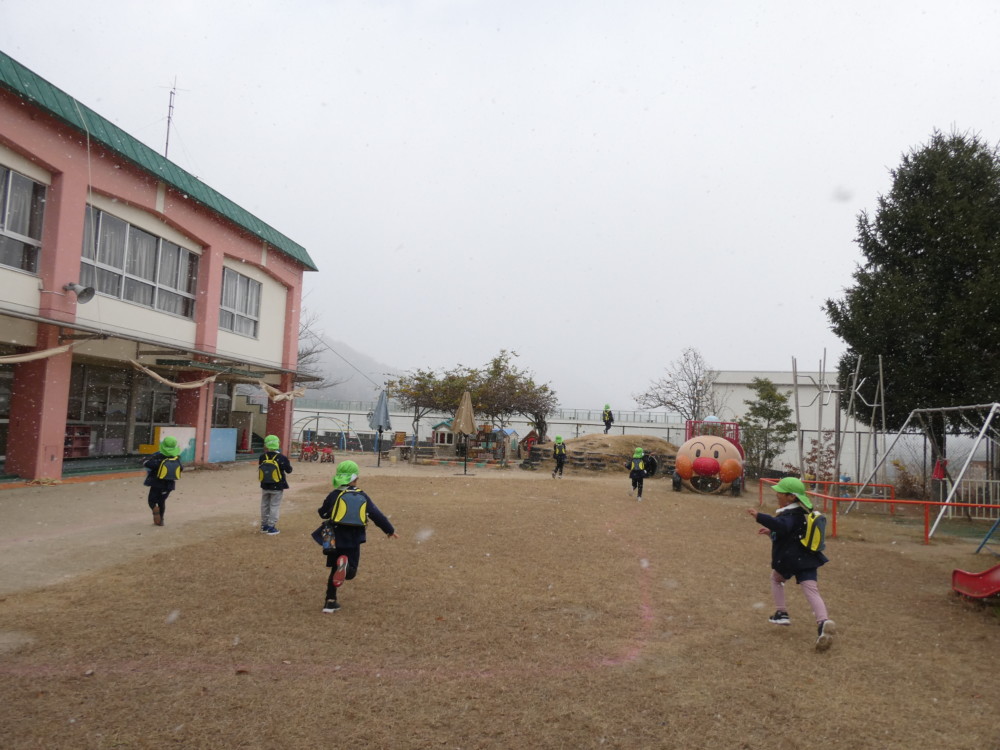 雪を見てはしゃぎ、走り回り、心弾ませ、雪を喜ぶくまぐみの子どもたちの姿を見て