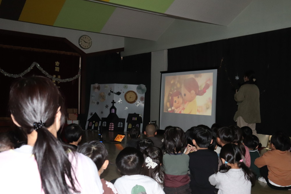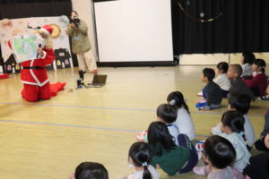 サンタさんがノルウェーからやって来てどうやって幼稚園まで来たのかなどわかりやすくムービーや紙芝居を使って英語で自己紹介をしてくれました(^^♪