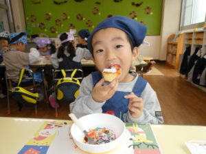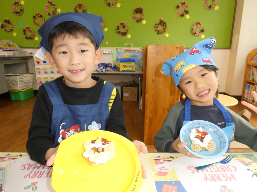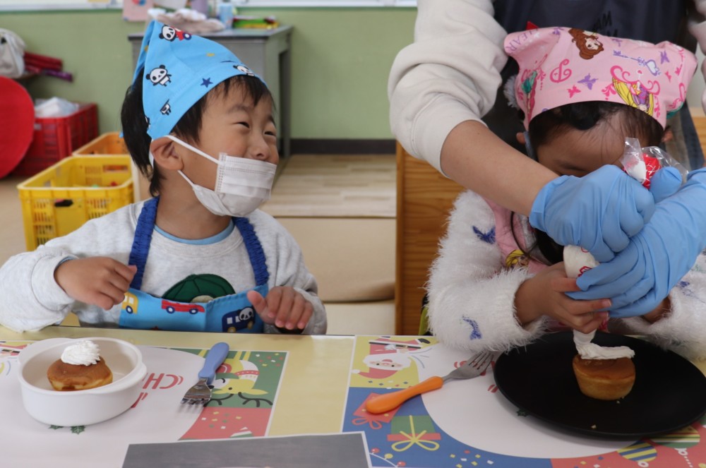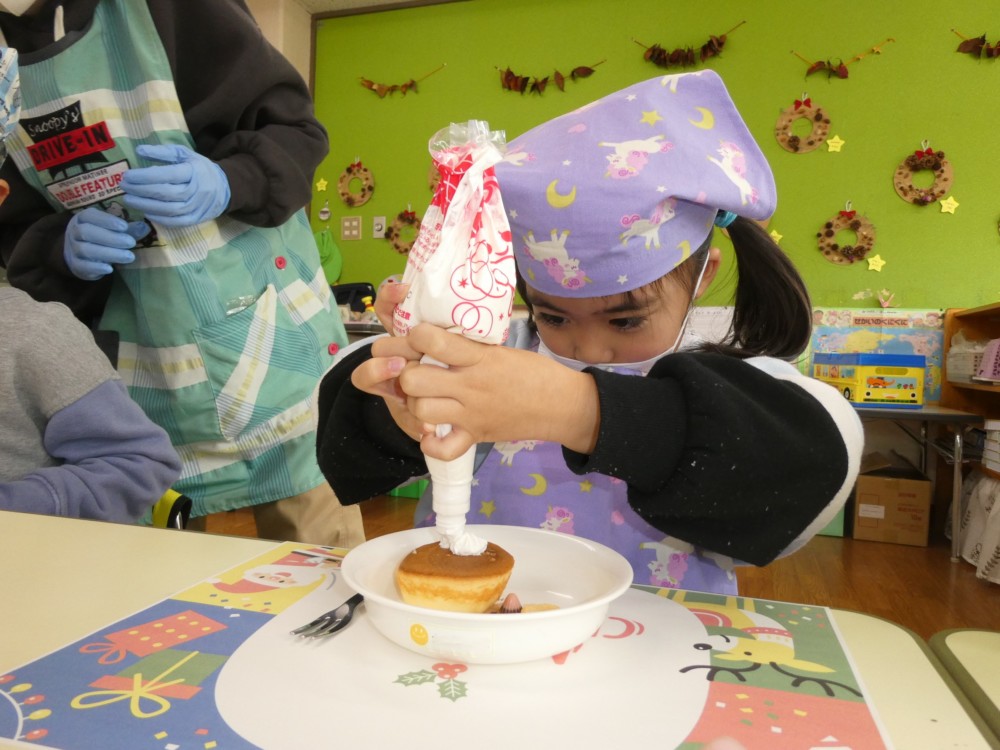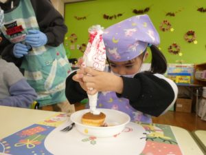 クリームを絞り、ジャムやお菓子を使ってサンタさんやトナカイ、雪だるまなど作りたい形に飾りつけをしました(*^-^*)