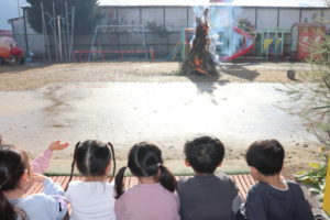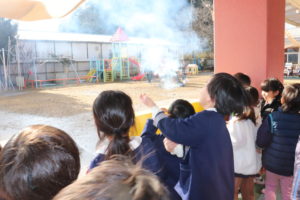 火が付くと「わぁ~!」「燃えてきた!」と燃える様子を見守りました