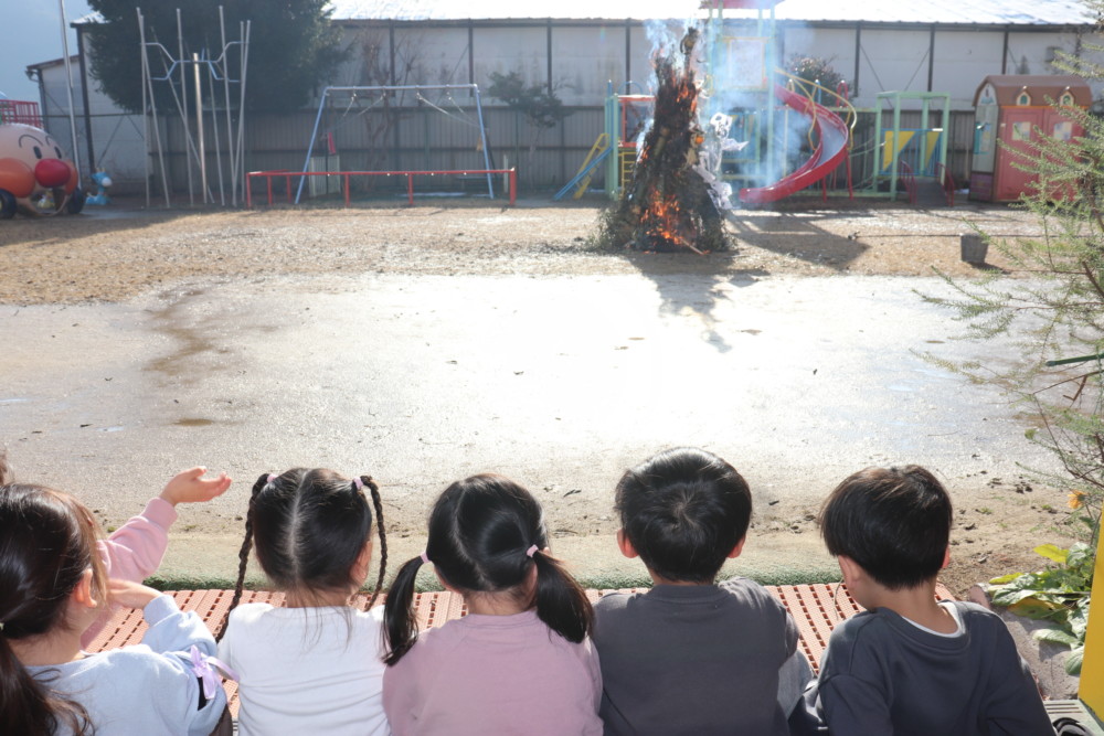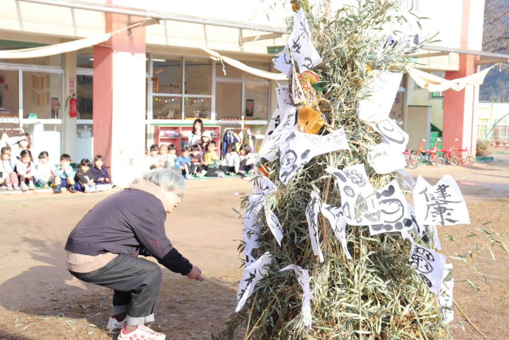 子どもたちの書初めやしめ縄を飾っていざ点火!