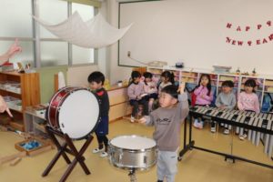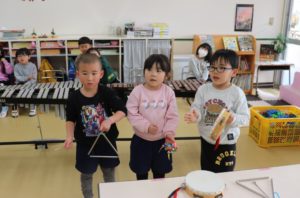 年中組さんは、いろいろな楽器の音を鳴らして、リズム打ちに挑戦!!
