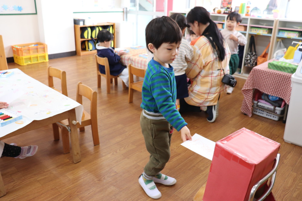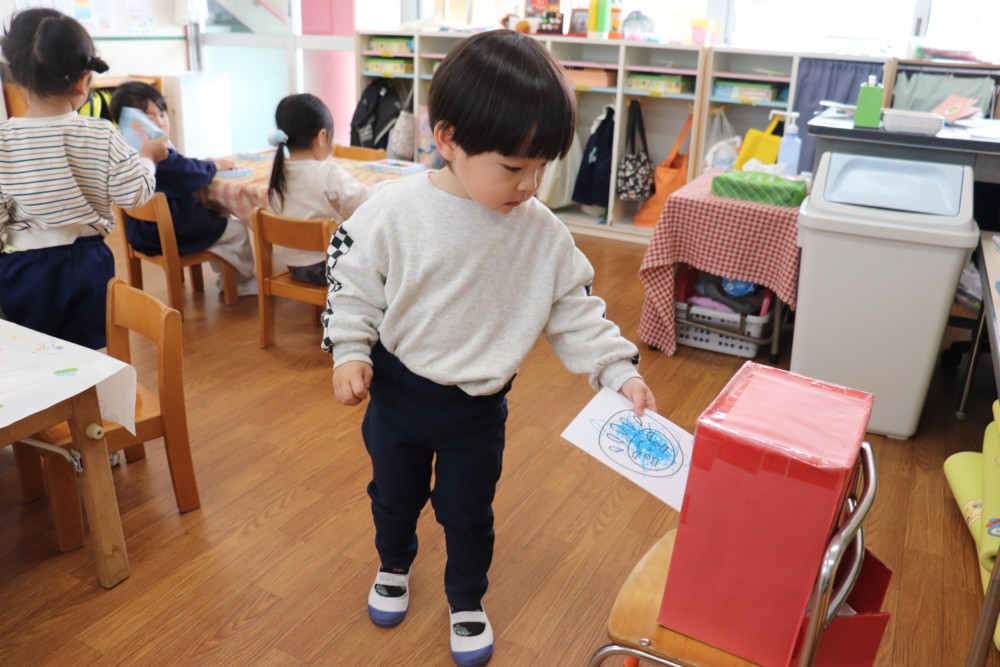 お部屋の中では満3歳うさぎ組さんが郵便ごっこ〠