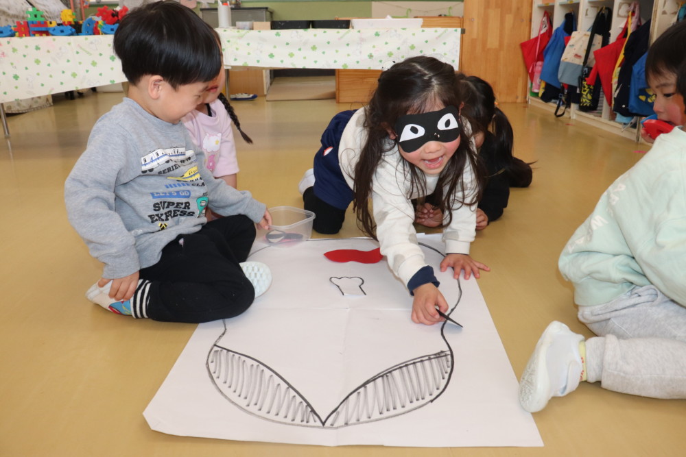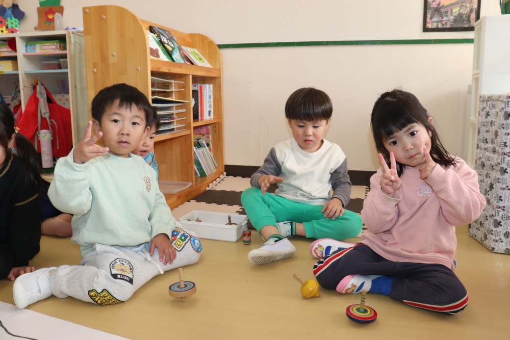 年少組さんはコマ回しや福笑いをして遊んでいました♪