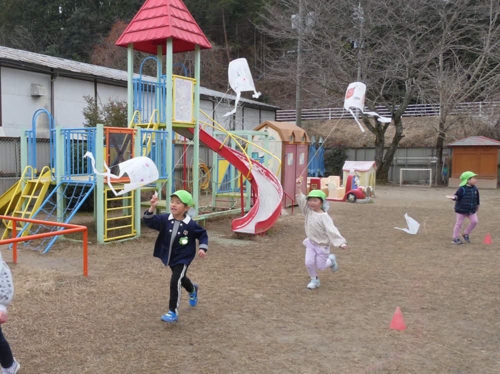 年長組さんは、好きな絵を描いた手作り凧で凧あげ☆