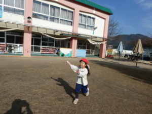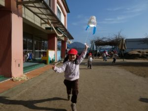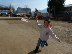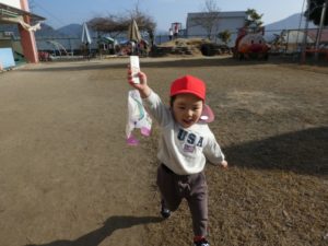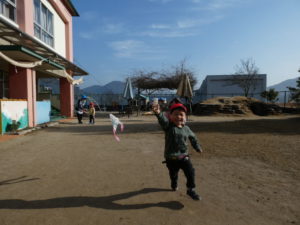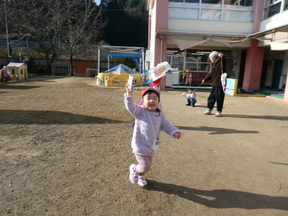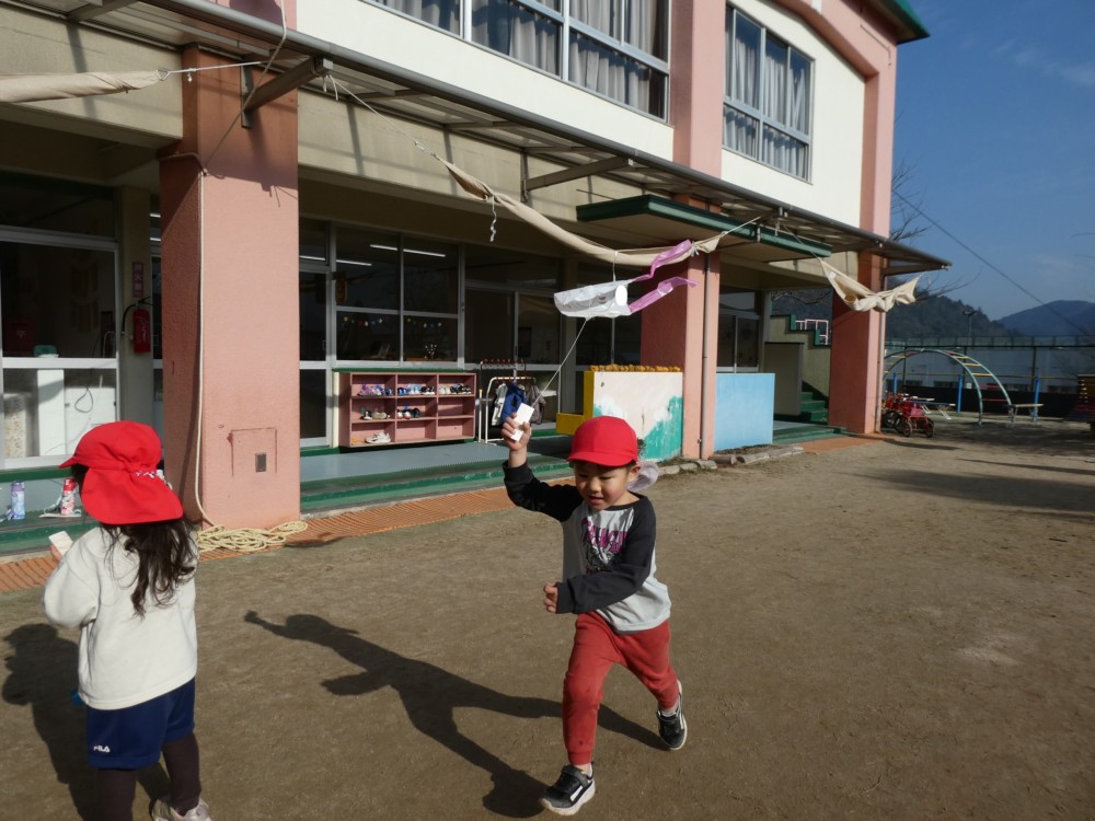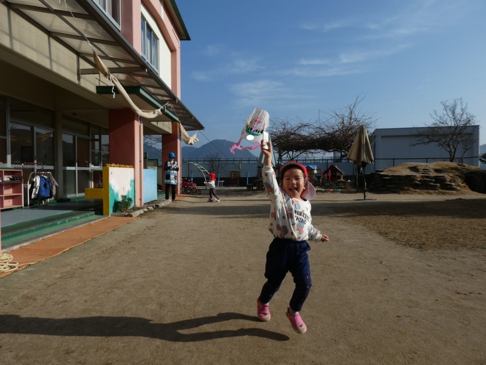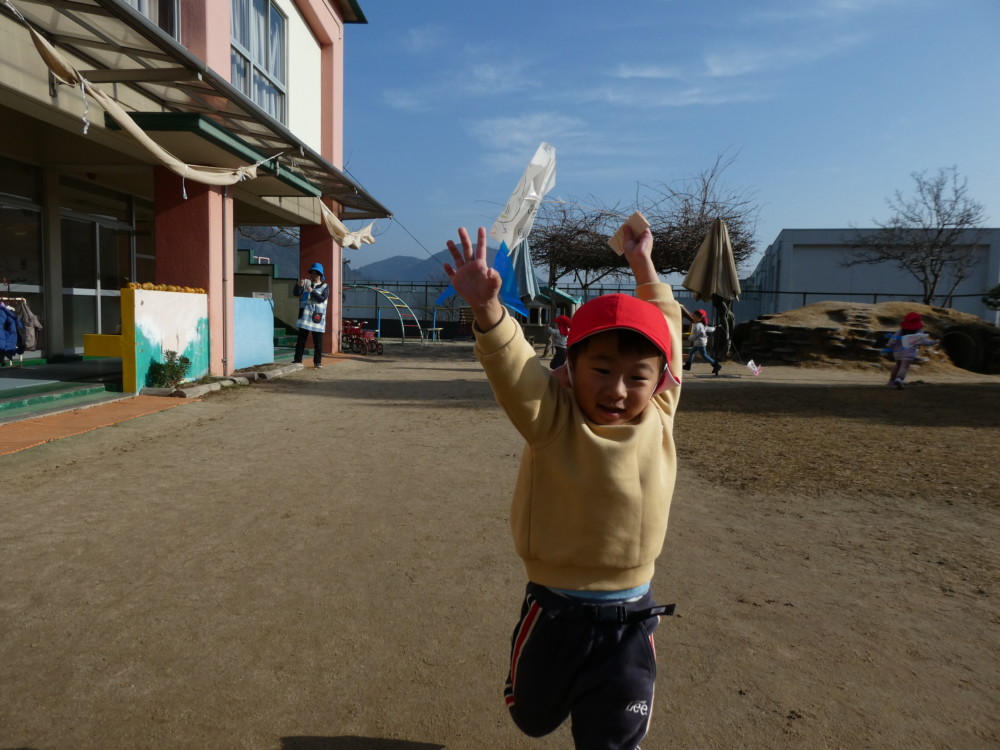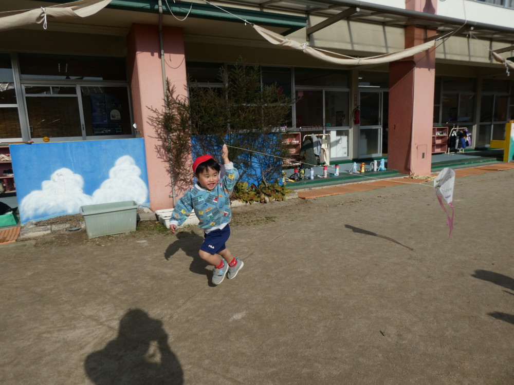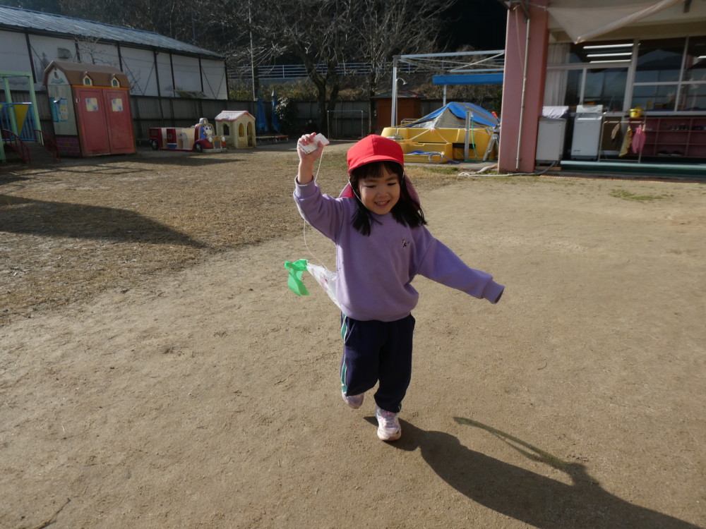自分で作った凧を手に、園庭を元気いっぱい走るお友だち(^^♪