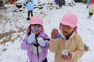今週は寒波の影響で寒くなるということで、園庭のいろいろな場所に色水を入れた容器を置いていた子どもたち。