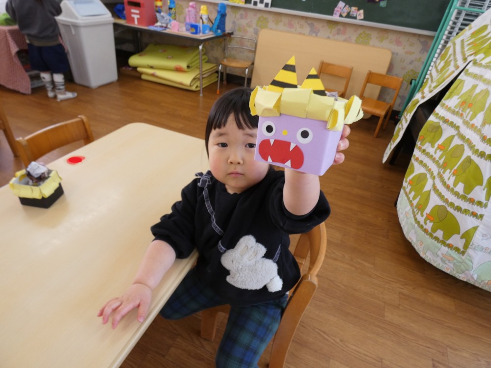 来週は節分ということで、満3歳児うさぎ組さんでは鬼のお面や豆入れの製作をしてきました。