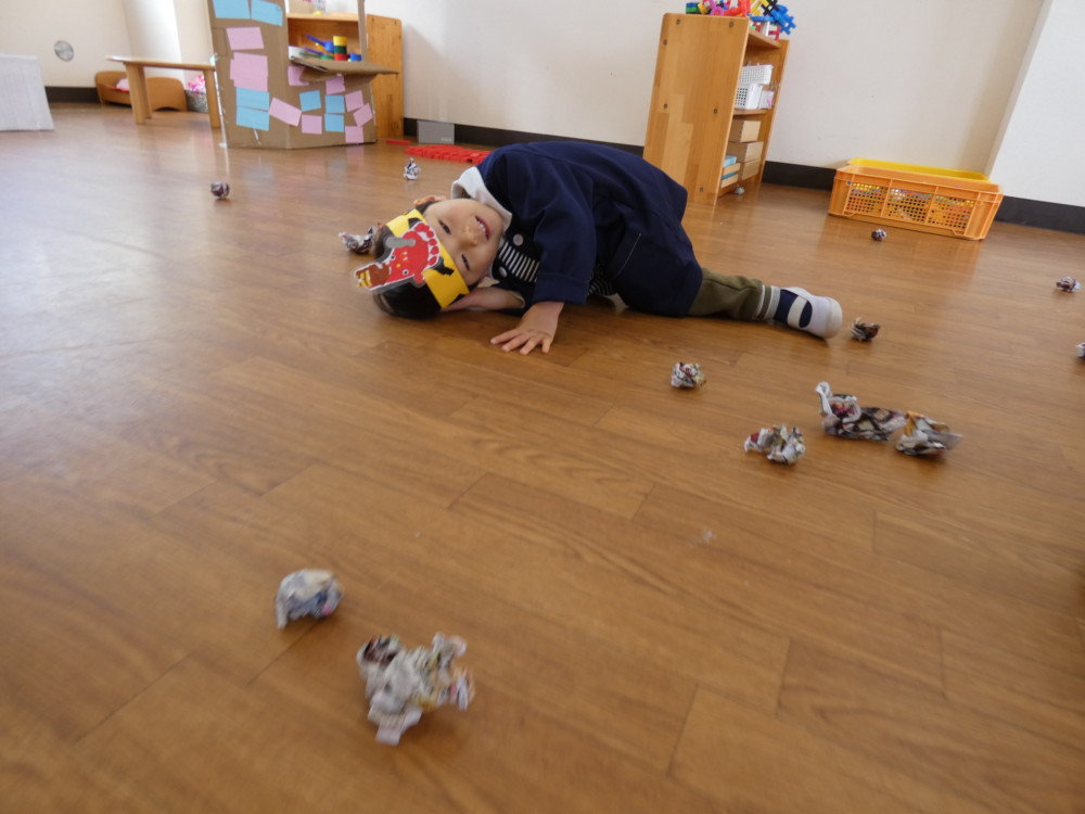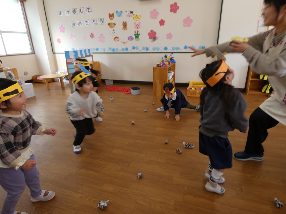 今日は、完成したものを使って豆まきごっこをしました。