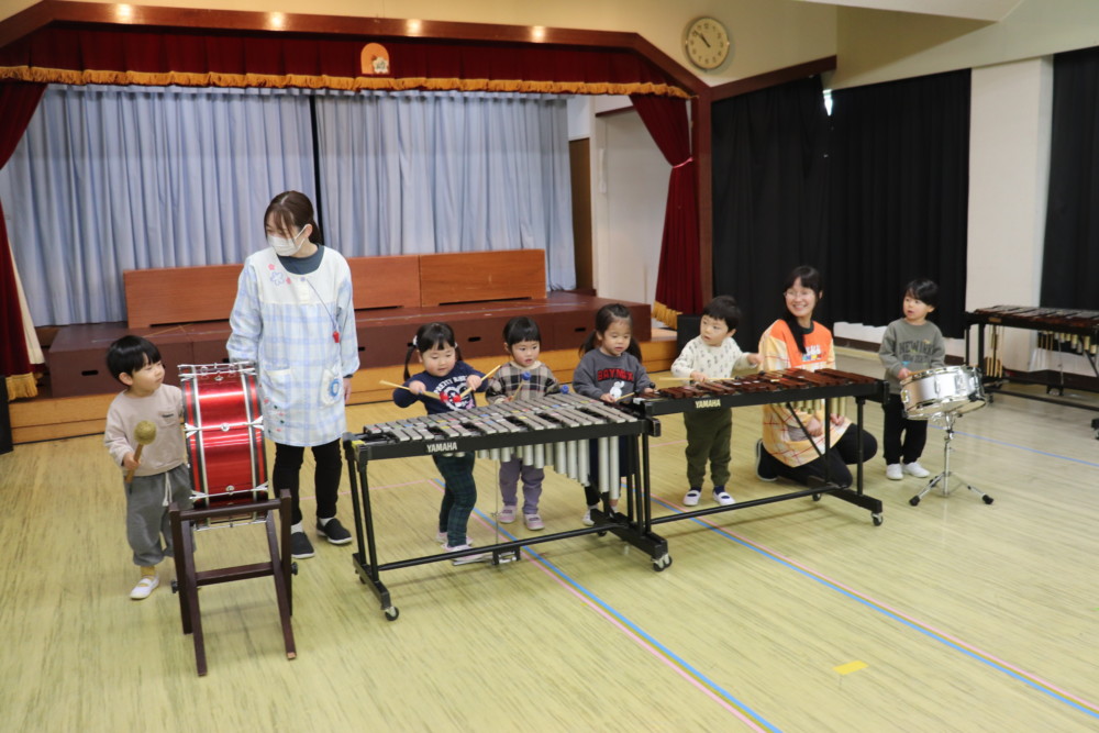 練習の後、満3歳うさぎ組のお友だちも興味を持った楽器に触れながら音遊びを楽しみました(*^-^*)