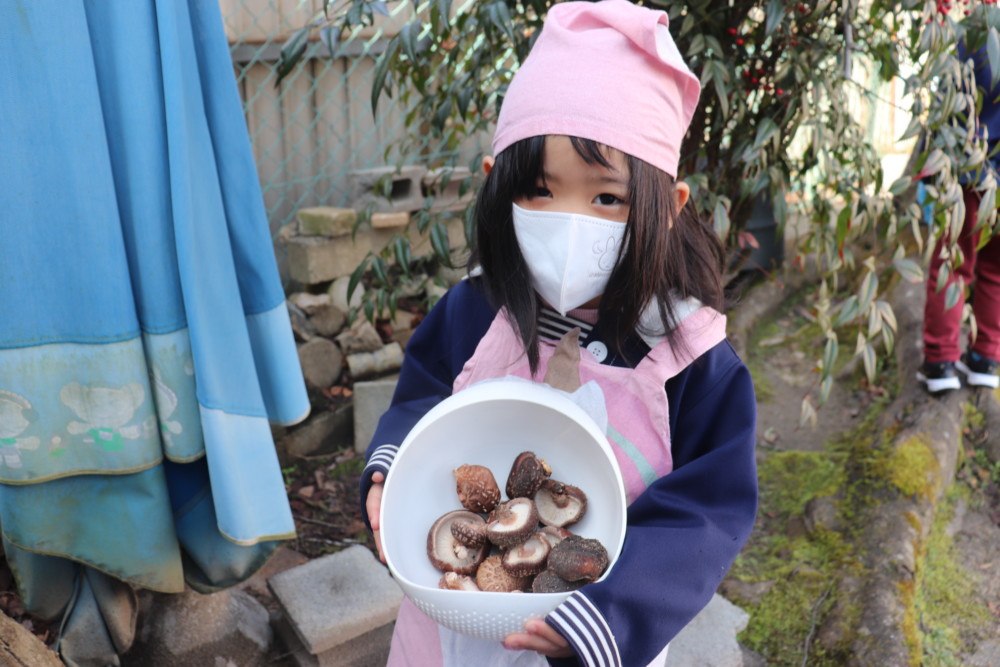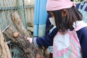 園庭の原木にシイタケがたくさんできていたので、年中組さんが収穫しました。