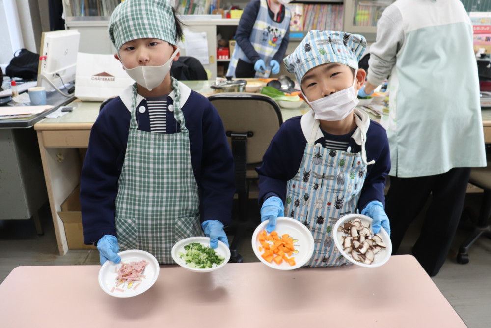 年長組さんが人参、チンゲン菜、ハムを切りました。