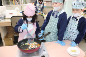 最後に、ごま油を入れたフライパンに具材を入れて一人ずつ順番に炒めていきました。