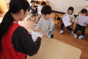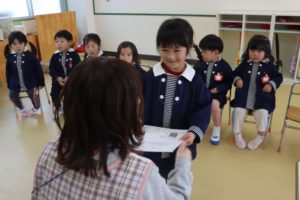 園長先生にみんな一つずつ大きくなって4月から新しいお部屋、新しい先生