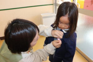 久しぶりに登園し進級したお友だちは、新しいクラスのお部屋に入り、名札を担任の先生につけてもらいました(*^-^*)