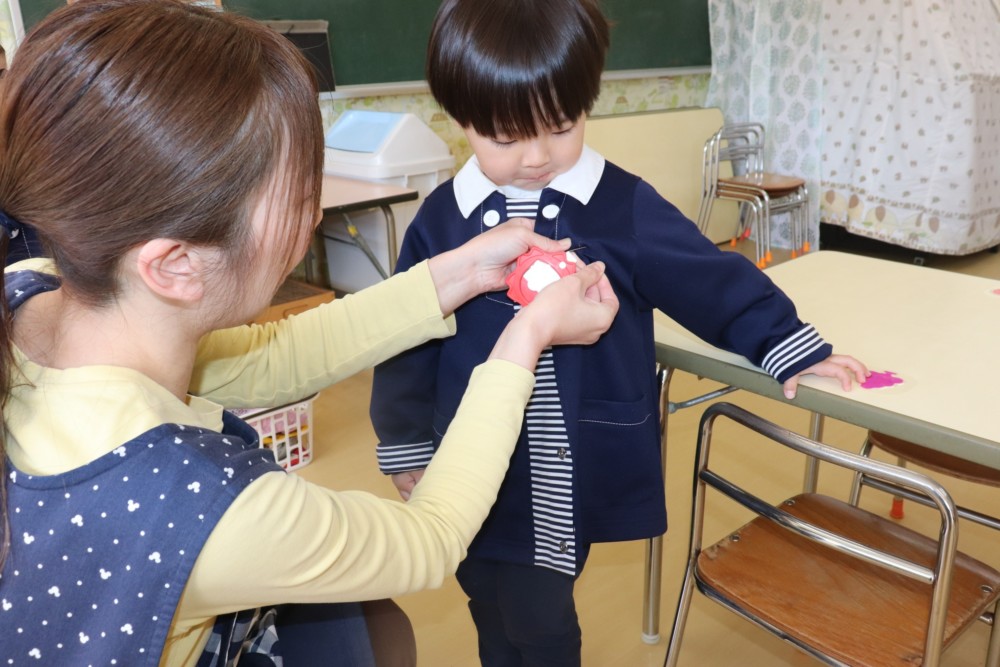久しぶりに登園し進級したお友だちは、新しいクラスのお部屋に入り、名札を担任の先生につけてもらいました(*^-^*)