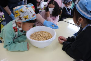 今日は年長組のお友だちが、味噌づくりをしました。